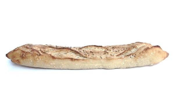 Das Mehl für dieses große Baguette kommt aus dem Süden Frankreichs, von der „Moulin de Colagne“. Es wird nach traditioneller Art mit Steinmühlen gemahlen und enthält sehr viele klein gemahlene Schalenreste und somit auch mehr Ballaststoffe als reines Weißmehl. Zur Abrundung des Geschmackes enthält dieses Baguette noch etwa 18 % Roggenmehl (deutsches Bio-Roggenmehl). Das Rezept stammt vom Müller selbst, der zugleich auch Bäckermeister ist. Es wiegt etwa 570 g.